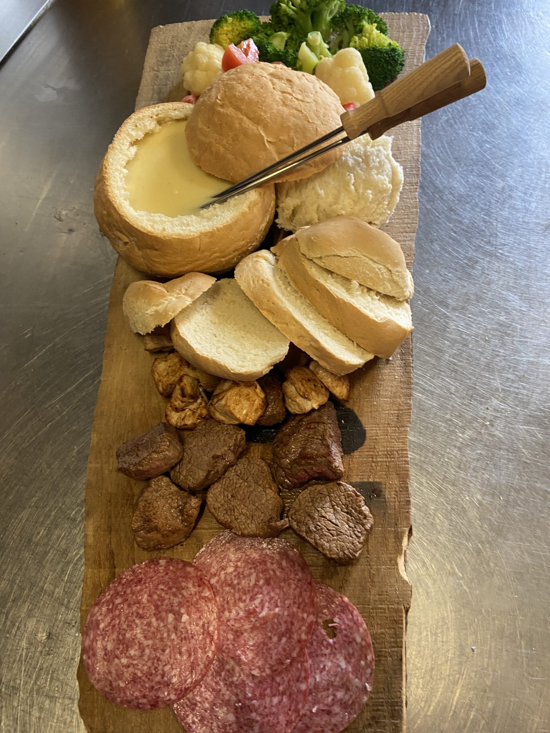 Onze huisgemaakte kaasfondue wordt geserveerd in ons eigen gebakken brood en wordt geserveerd met verse groentes en vlees dit is een meer prijs van € 9,50 pp ( ossenhaas, kipfilet, salami).